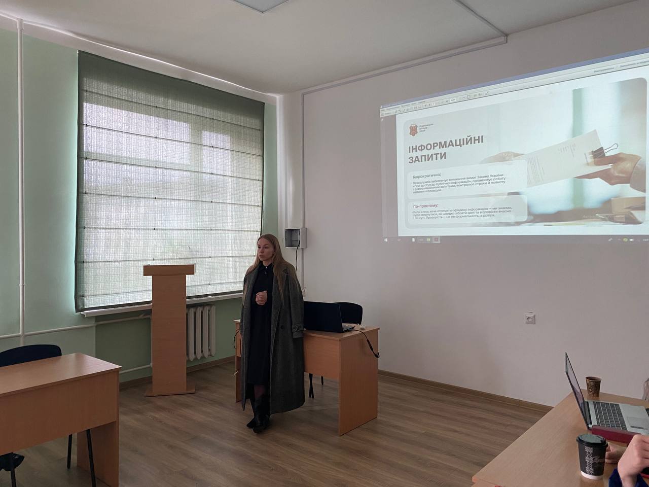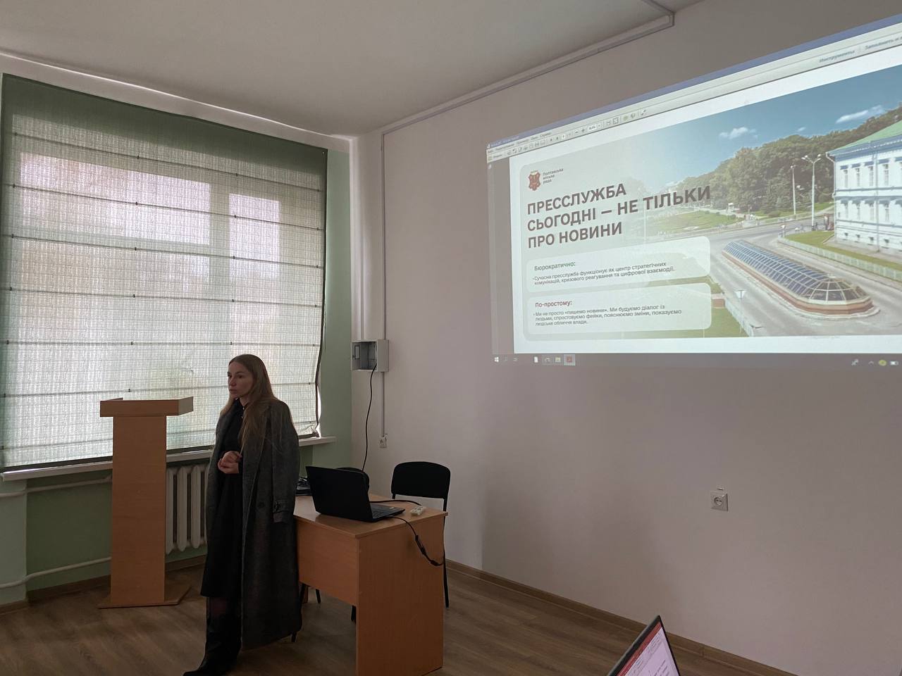 Гостя поділилася зі студентами практичним досвідом та детально окреслила завдання, які стоять перед пресслужбою органу місцевого самоврядування. Під час розмови вона наголосила на особливій відповідальності та специфіці цієї роботи. Спікерка підкреслила, що сьогоднішня пресслужба ОМС активно будує діалог із громадою, пояснює складні зміни та забезпечує прозорість роботи міської влади, виходячи за межі простого інформування.