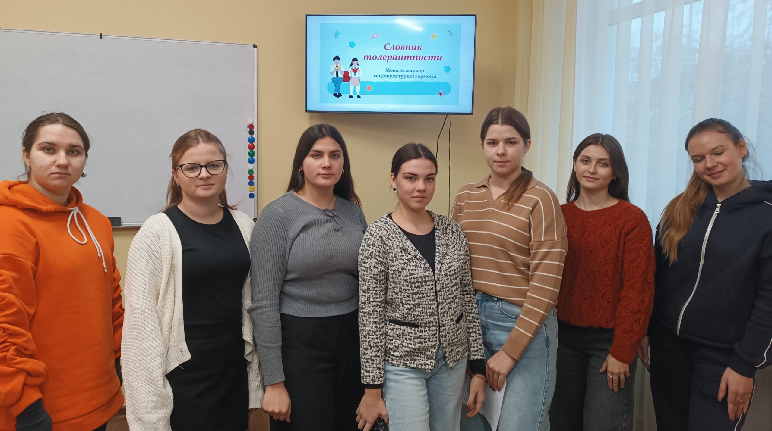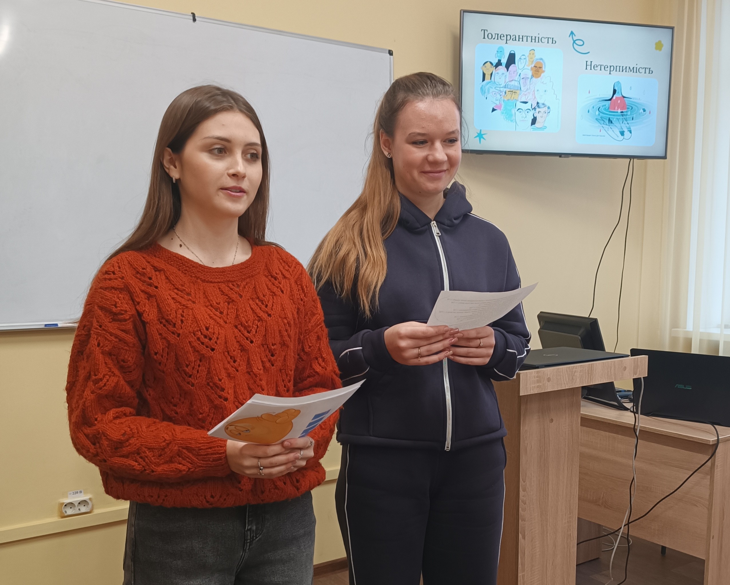 Студенти групи СОу-25 поділилися своїми роздумами про толерантність, подискутували про роль евфемізмів у сучасній комунікації та презентували «Словник толерантности», який зможе стати справжнім дороговказом до взаєморозуміння. Також вони провели цікавий інтерактив, залучивши всіх присутніх до жвавого обговорення.