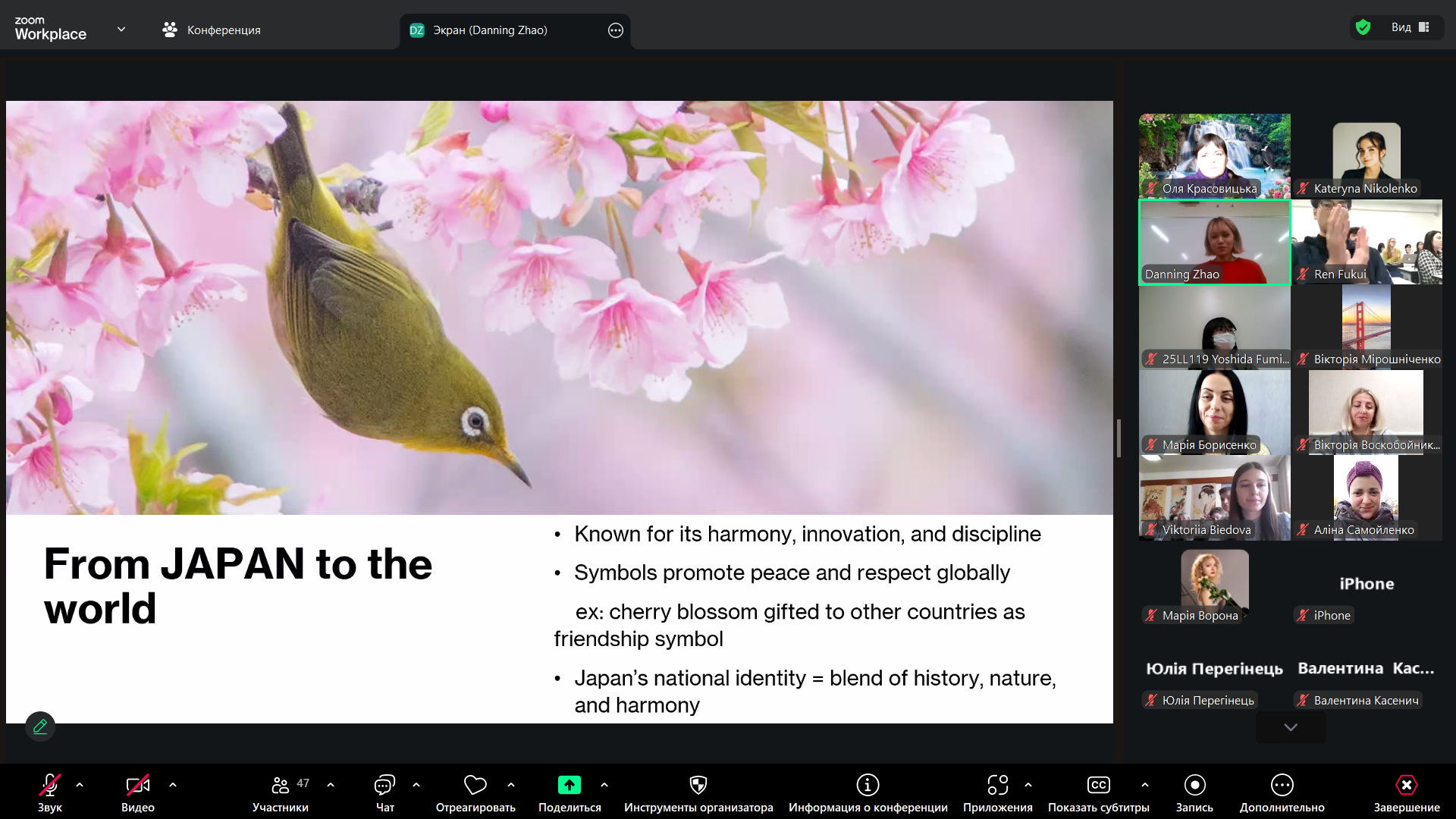 Студентка із Сайтама Університету Koharu Sue (Японія) представила глибоку презентацію на тему “Національна ідентичність та символи Японії”.