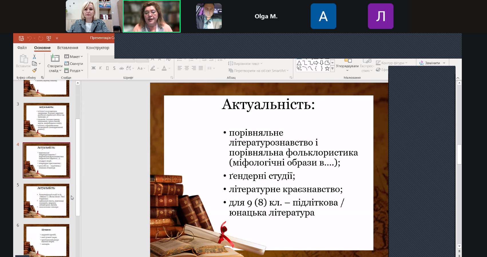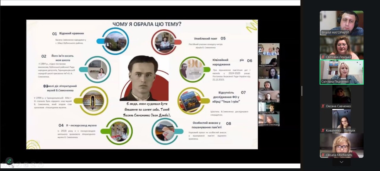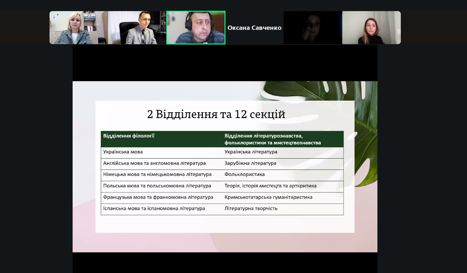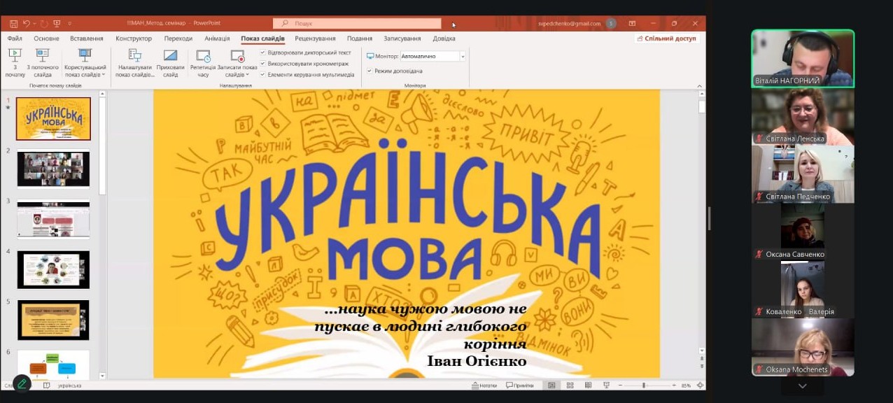 Доцентка Світлана Педченко продемонструвала присутнім приклади актуальних тем учнівських наукових проєктів й окреслила основні труднощі, які виникають перед юними дослідниками української мови та їхніми керівниками. Вона зосередила увагу учасників семінару на напрямах сучасних лінгвістичних студій, на доборі відповідного ілюстративного матеріалу, методиці роботи з джерельною базою мовознавчої розвідки.