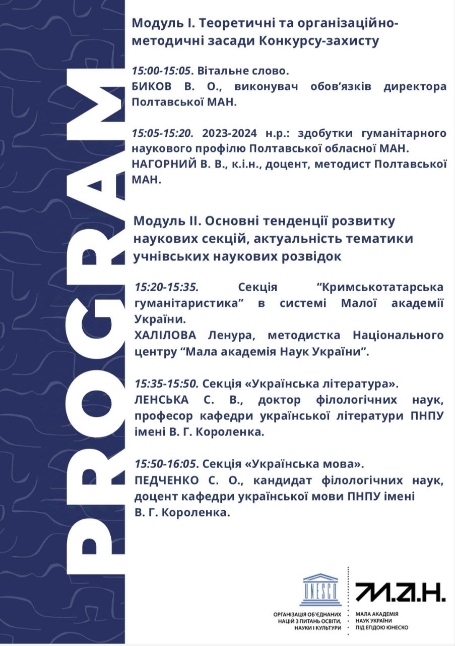 У роботі модуля «Основні тенденції розвитку наукових секцій, актуальність тематики учнівських наукових розвідок» узяли участь і викладачки факультету української філології та журналістики – голова журі секції «Українська література» завідувачка кафедри української літератури професорка Світлана Ленська й голова журі секції «Українська мова» завідувачка кафедри української мови доцентка Світлана Педченко. Кілька років поспіль Полтавська обласна МАН демонструє доволі високі результати, переможці ІІ (обласного) етапу здобувають призові місця на ІІІ (заключному) етапі змагання. Тож поділитися досвідом з педагогами області були запрошені викладачі, які мають значні досягнення в підготовці юних науковців.