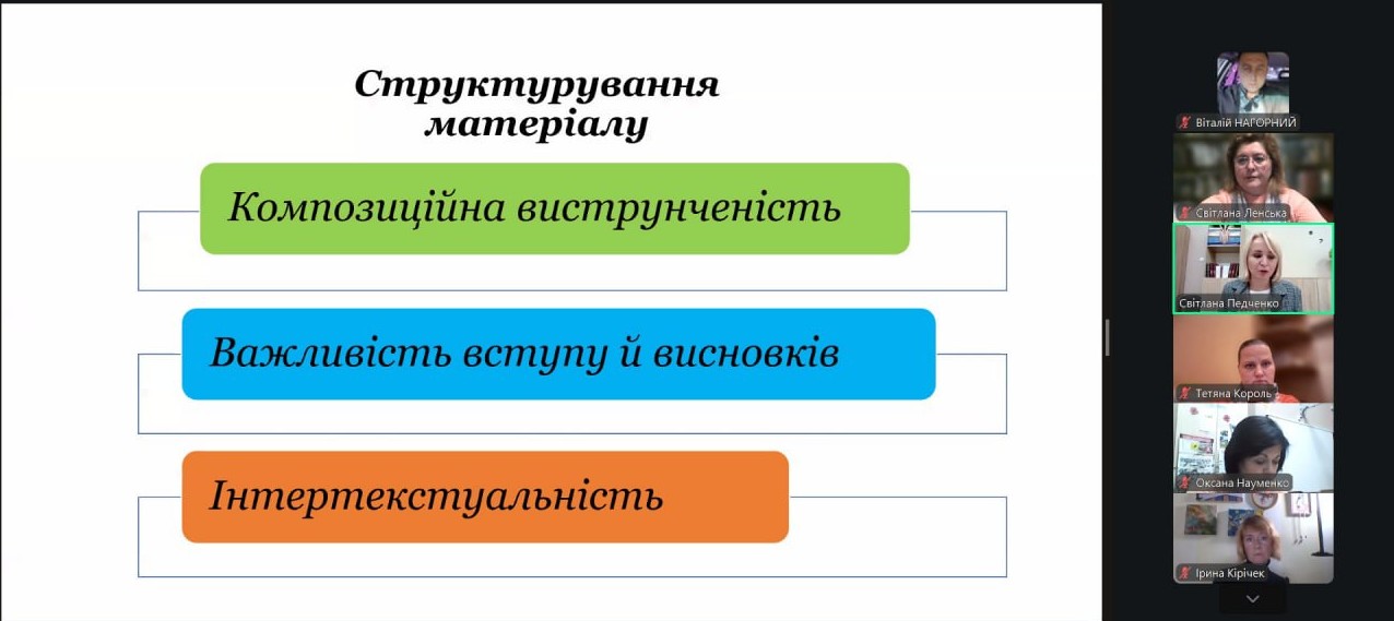 Світлана Олександрівна схарактеризувала особливості структурування опрацьованого в учнівському проєкті матеріалу, закцентувавши на важливості вступу та висновків, пропорційності розділів, інтертекстуальності, доречності цитувань, правильному оформленні покликань на теоретичні джерела. Доповідачка наголосила на культуромовних параметрах наукового тексту, адже мовознавча розвідка має бути стилістично довершеною, демонструвати загалу високу продуктивність українського наукового мовлення, засвідчувати панування державної мови в усіх царинах національного буття.