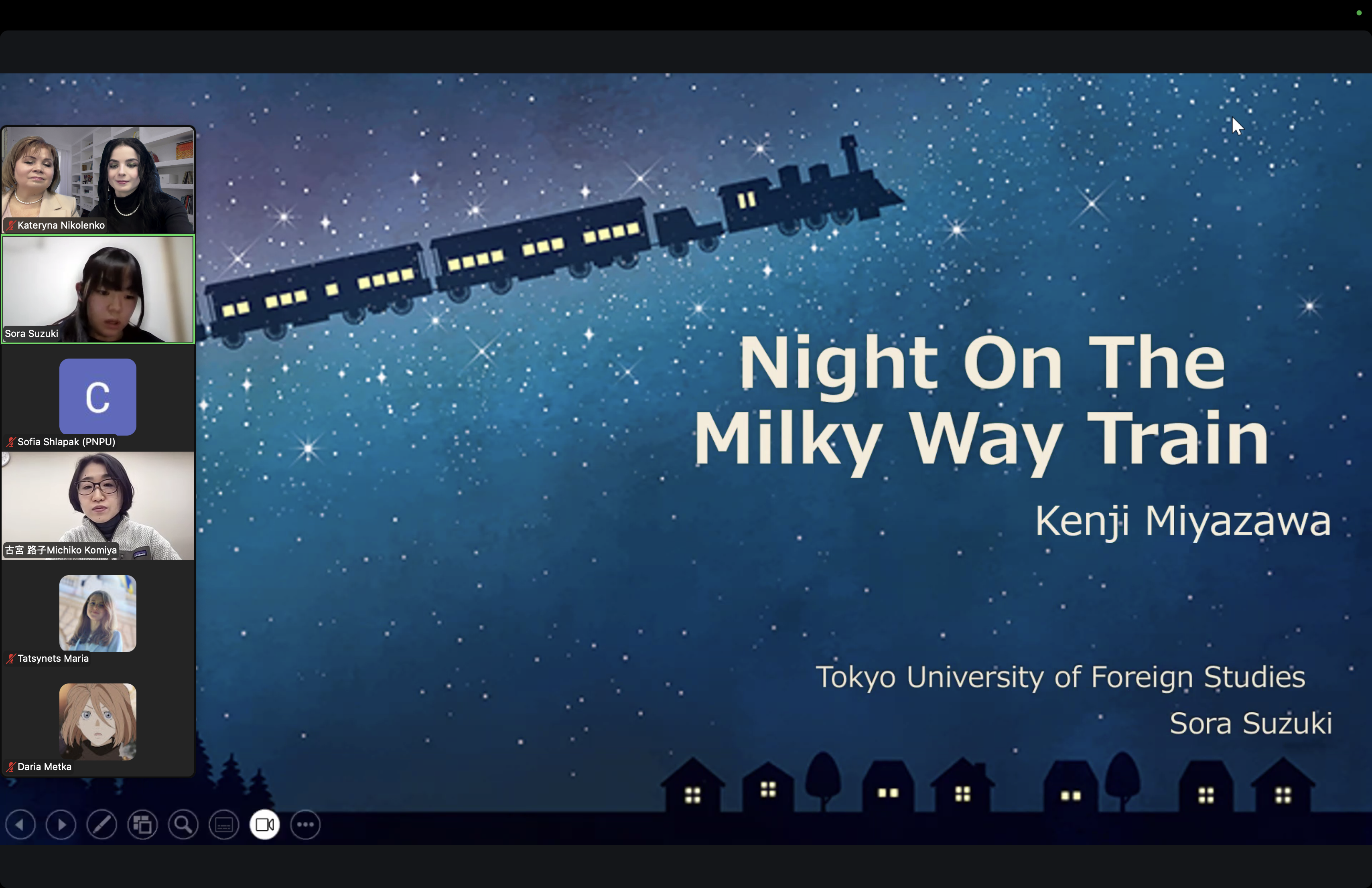 Студентка Sora Suzuki з Tokyo University of Foreign Studies (Japan) дуже цікаво представила філософський зміст спадщини японського письменника К. Міядзави і його твору “Night on the Milky Way Train”. Вона показала органічне поєднання фантастичного і реального у тексті, шлях головного героя до усвідомлення важливості турботи про інших.