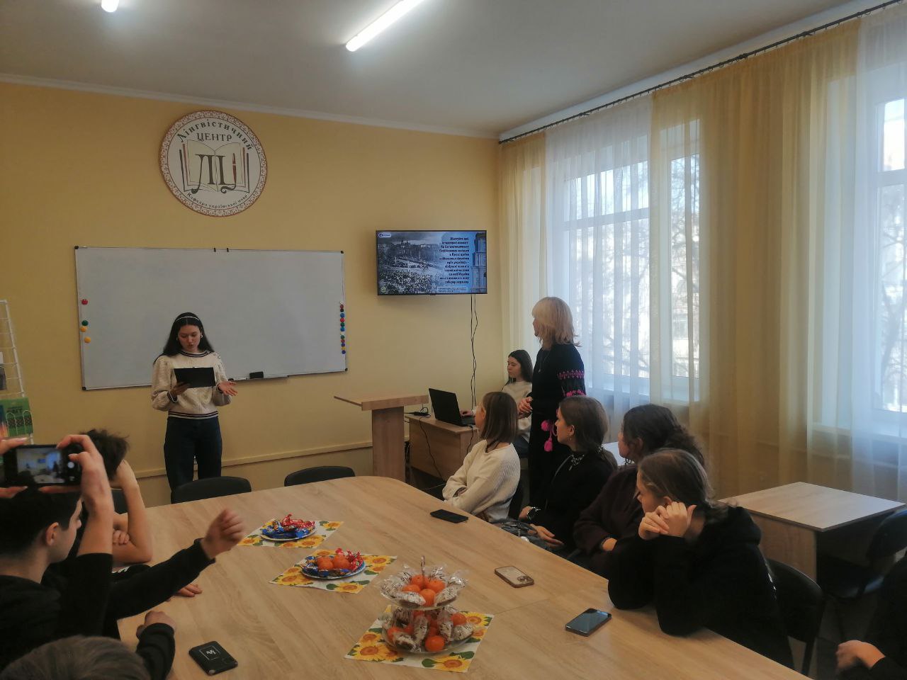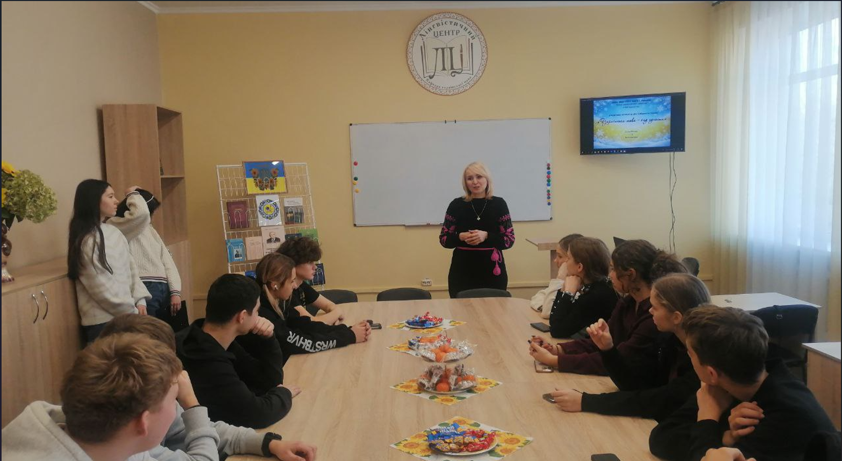 У «Лінгвістичному центрі» кафедри української мови ліцеїсти 9-Д класу разом із класним керівником Кравченко Дариною Володимирівною відвідали інтерактивну вітальню до Дня Соборности України «Українська мова – код єдности».