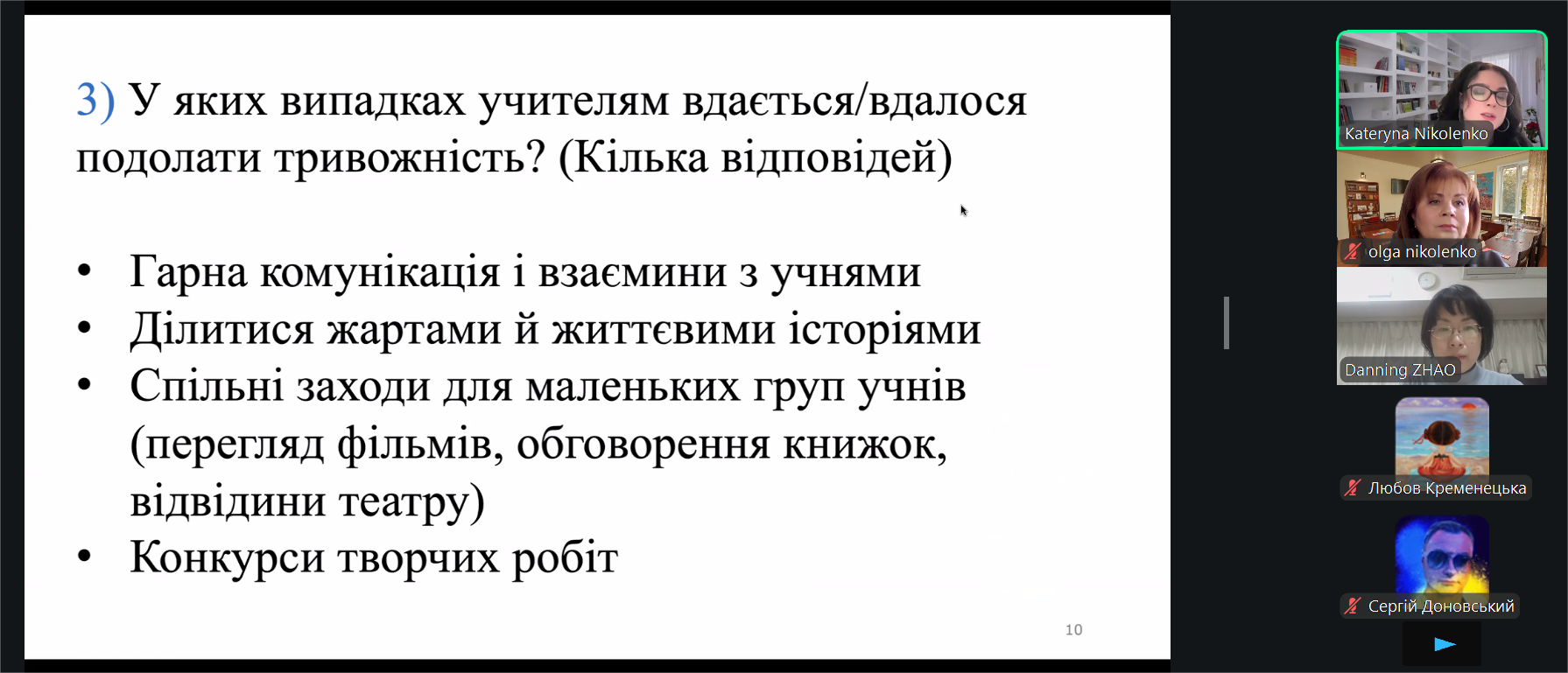 Координаторка психологічної служби міста Запоріжжя, голова Запорізької  філії Міжнародної асоціації психологів та тренерів-експертів Любов Кременецька висловила подяку від імені комунальної установи «Центр професійного розвитку педагогічних працівників» Запорізької міської ради японській психологині Danning Zhao та викладачкам Полтавського національного педагогічного університету імені В.Г. Короленка за важливу справу щодо відновлення психологічного здоров’я вчителів Запоріжжя.