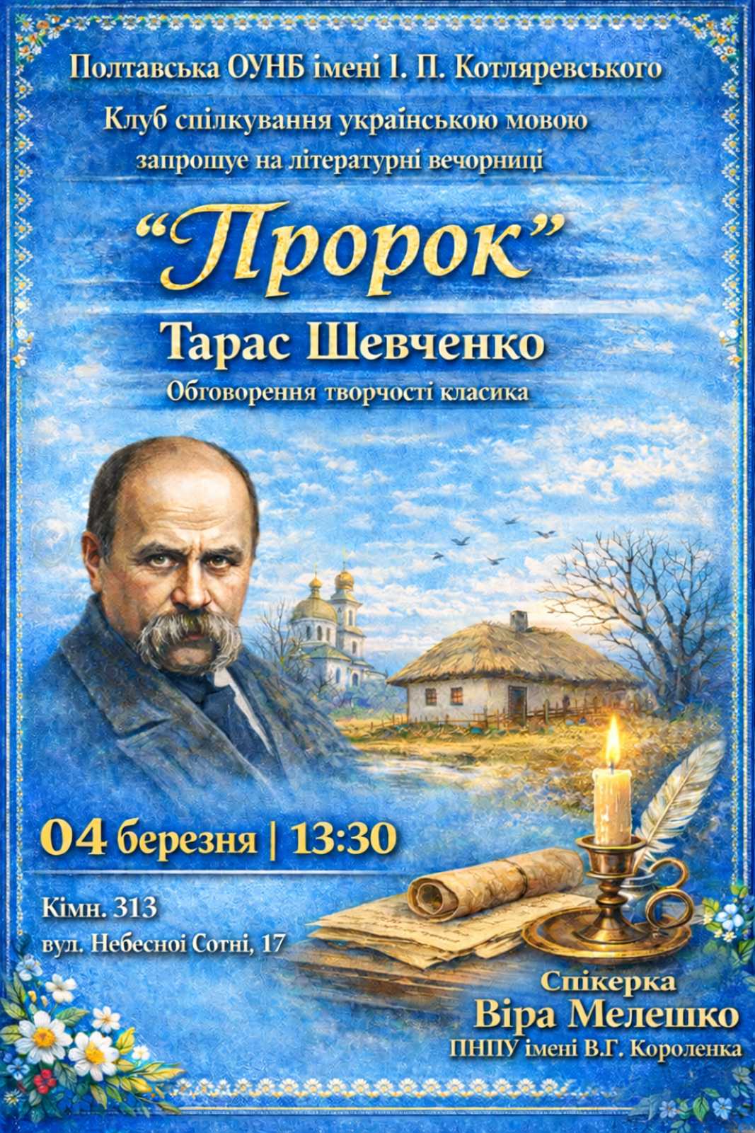 У межах відзначення шевченківських днів та проведення Тижня факультету української філології відбулося засідання Клубу спілкування українською мовою (платформа зустрічі – Полтавська обласна універсальна наукова бібліотека імені І. П. Котляревського). Засідання мало цікавий формат: літературні вечорниці «Пророк» Тарас Шевченко. Спікеркою зібрання стала Віра Мелешко, доцентка кафедри української літератури, «котра відома своїм умінням перетворювати сухі академічні знання на захопливу розповідь» (цитата зі сторінки Департаменту культури та туризму Полтавської ОДА).