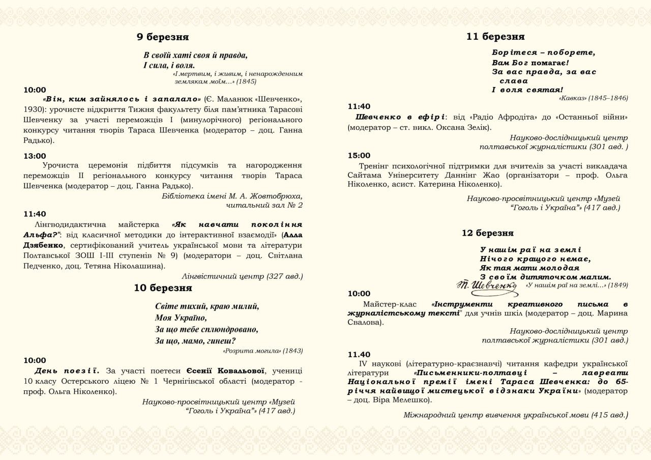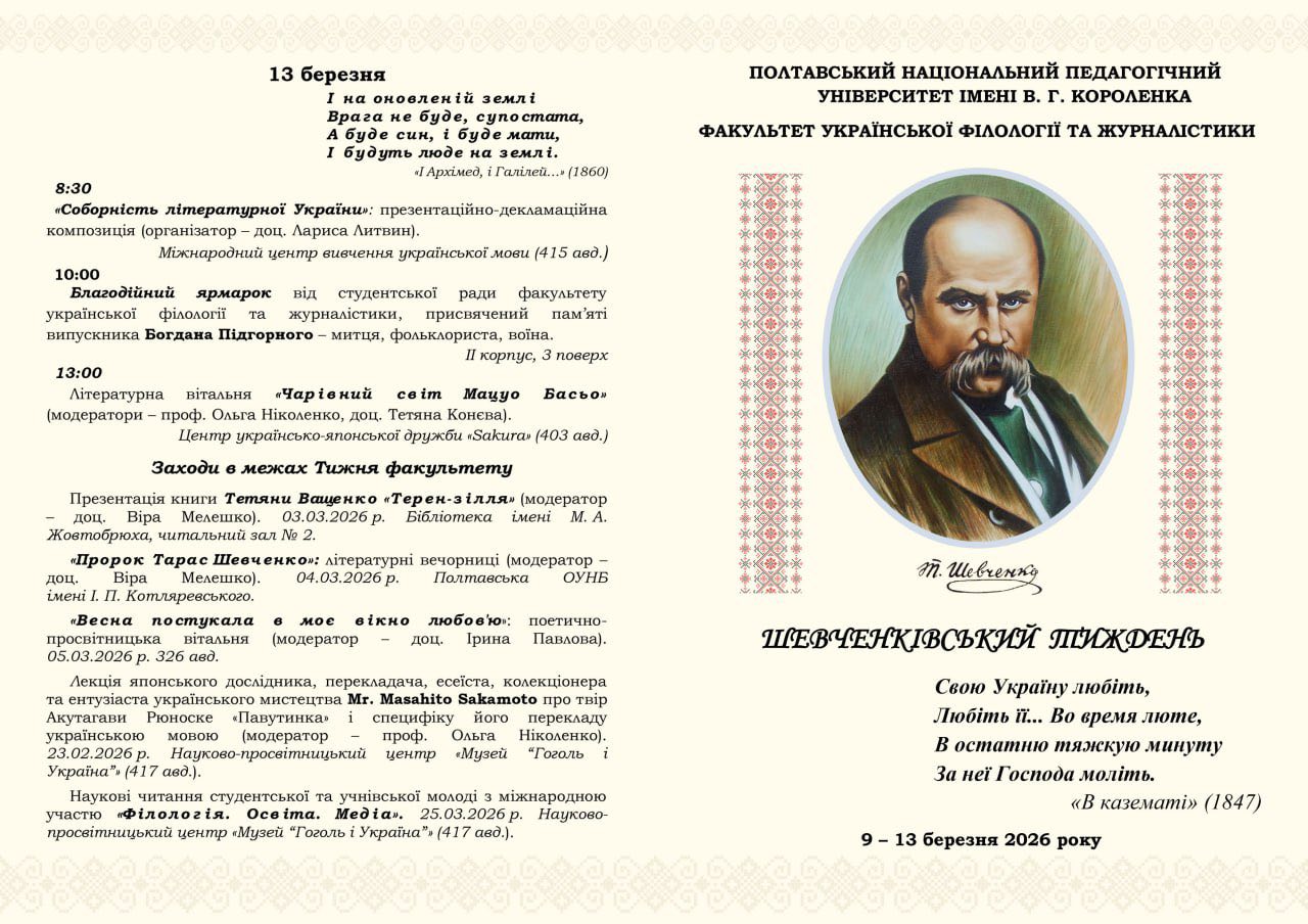 З ініціативи декана пані Оксани Кирильчук студентство та викладачі факультету української філології та журналістики Полтавського національного педагогічного університету імені В. Г. Короленка 9 березня 2026 року, у 212-ті роковини від дня народження Тараса Шевченка, біля пам’ятника Пророкові у Полтаві зібралися на урочисте відкриття Тижня факультету, який проходитиме з 9 по 13 березня під його духом і творчістю. Перший день факультету символічно спрямовували рядки з послання «І мертвим, і живим, і ненанарожденним землякам моїм в Україні і не в Україні моє дружнєє посланіє» (1845): «…в своїй хаті своя правда і сила, і воля».