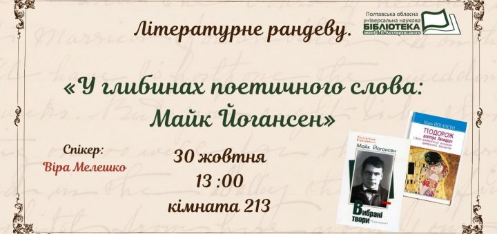 до ювілею Майка Йогансена У Полтавській обласній універсальній науковій бібліотеці імені І. П. Котляревського відбулося «Літературне рандеву “У глибинах поетичного слова”», присвячене 130-річчю від дня народження Майка Йогансена (1895–1937). Спікером науково-популярного дійства була Віра Мелешко, доцентка...